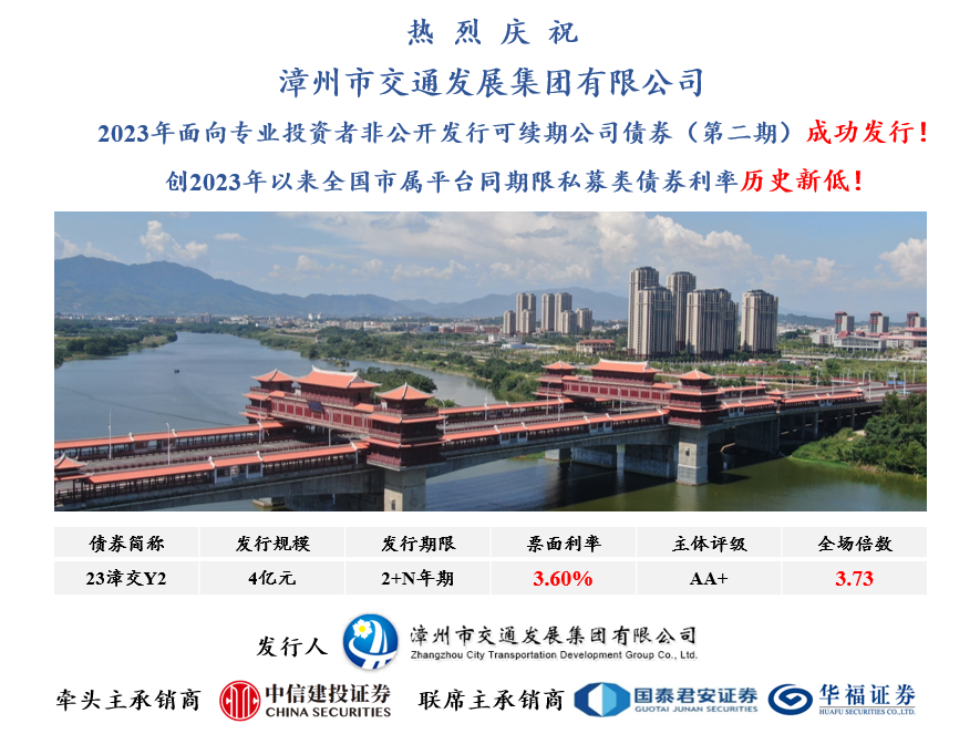 漳州交通集團(tuán)此次發(fā)行創(chuàng)下了2023年全國市屬平臺(tái)同期限(2+N)私募類債券利率的歷史新低,體現(xiàn)了集團(tuán)在債券市場上的強(qiáng)大影響力,也進(jìn)一步證明市場對(duì)漳州交通集團(tuán)穩(wěn)健經(jīng)營和良好前景的高度認(rèn)可。
